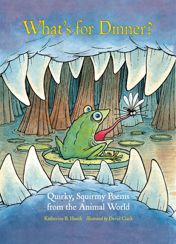 As the title poem cautions us, "...finding food/ is not a joke./ Living things must eat/ or croak." In the natural world, all creatures have their place in the food chain. Hauth's 29 poems utilize humor, action verbs, and scientific language to convey information about predator-prey relationships. Clark's illustrations further illuminate Hauth's wit, and serve as concrete exmples of the actions depicted in each poem. While the "quirkier" aspects of the food chain receive the lion's share of attention--the mouth-numbing slime of the banana slug, the baby wasps that hatch within the caterpillar they consume for their first meal, and the beetle and moth eggs that receive nourishment from sloth dung, to name a few--Hauth provides the reader with a foundation in food chain relationships and vocabulary. Several poems illustrate various forms of symbiosis; another one, entitled "Eating Words," explains, stanza by stanza, the difference between insectivores, carnivores, herbivores, and omnivores. The juxtaposition of poems across the gutter allows the reader to see similarities between the eating habits of very different creatures. For example, both the nighthawk and the little brown bat catch insects at night while in flight; the marabou stork and the hyena both eat the same kill, but at different times. Two sections within the back matter provide the reader with additional information about the poems and animals, and a book list is included for curious readers.