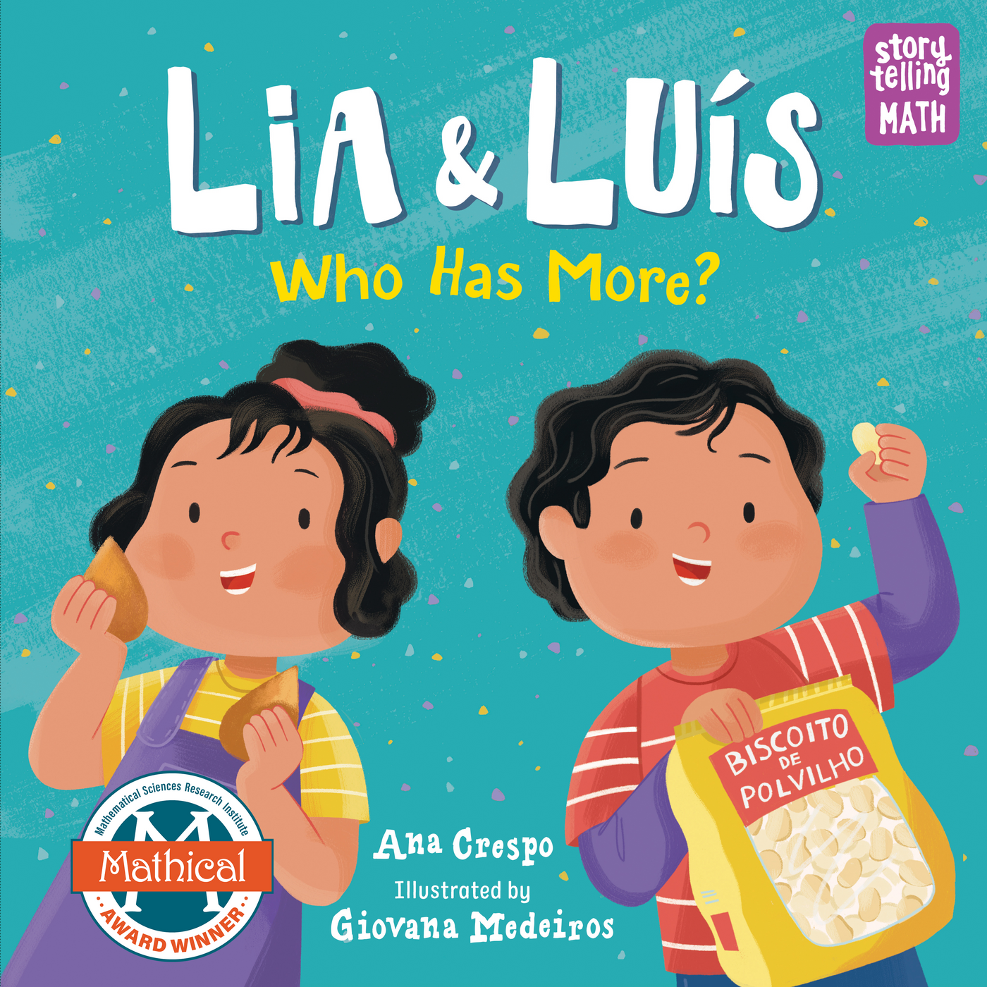 A classic sibling debate sets the stage for this effective, child-led exploration of measurement methods. After Lia and Luís visit their family’s store to get their favorite Brazilian snacks, they wonder: is Luís’s one bag of tapioca biscuits “more” than Lia’s two chicken croquettes? In text sprinkled with Portuguese words (a glossary with a pronunciation guide is included at the end), the two children go back and forth, counting, comparing, and measuring: “She has two croquettes. Luís has only one bag of biscuits. Maybe Lia does have more.// Or maybe not... Luís has... 98, 99, 100 biscuits.” Eventually, Lia discovers who has more by weight and finds a way for each child to have an equal amount. Medeiros’s cheery, colorful digital illustrations capture the children’s frustration, concentration, and joy. Includes four additional adult-led activities to encourage children to think more about measurement and comparison.