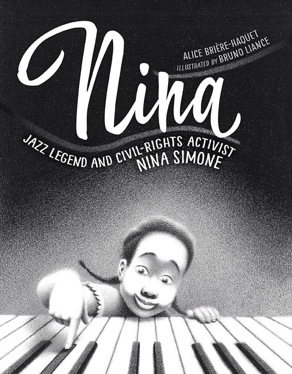 With a framing story that has Nina Simone telling her life as a bedtime story to her daughter, this imported French picture book chronicles the experiences that led her to become a classically trained jazz legend and civil rights activist. An early brush with racism occurred at her church, when Nina’s mother sat proudly in the front row awaiting her young daughter’s piano debut performance, until the arrival of white parishioners meant she had to move. Even piano lessons reminded her of racial inequalities because, as her teacher explained, the “white keys are whole notes and the black keys are flats, or half notes . . . that’s just the way it is.” Eventually, the young lyricist was moved to voice her resistance to social inequalities, and her musical gifts would score her journey to impact society. The story moves in quick, impressionistic beats that focus on feelings rather than biographical detail, but it’s fluidly told, and it may whet listeners’ appetites for more. Liance evokes a dream- like state in the appropriately monochromatic illustrations as soft grainy charcoal allows black and white to merge in shades from dark to pale; creative, symbolic interpretations are dramatic, as in the minimalist image of white people seated as on a bus while black people stand behind them with fists upraised in what could be a grab onto the unseen strap—or a black power salute. Librarians in search of a way to inspire today’s youth with exceptional children of generations past will want to make room in their collections for Nina.