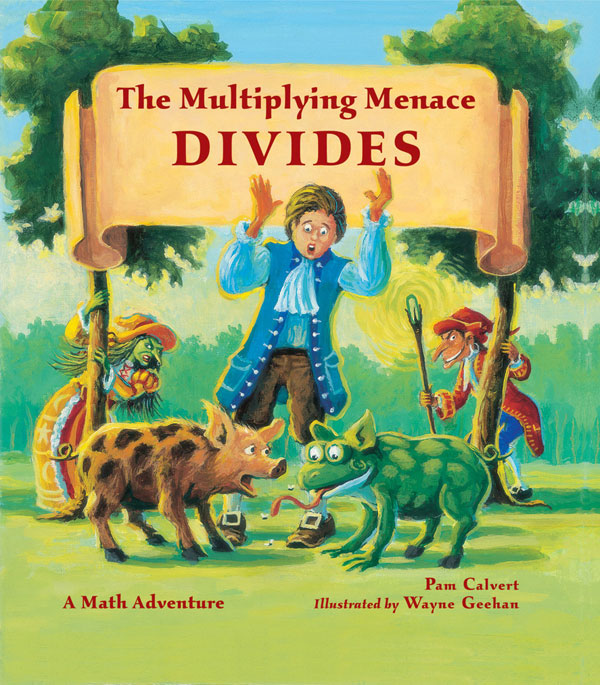The Multiplying Menace Divides is a sequel to The Multiplying Menace: The Revenge of Rumpelstiltskin. In the first book, Rumpelstiltskin was banished to the Abyss of Zero by Peter, son of the king and queen. In this sequel, the concept of division is introduced to young readers. As the story unfolds, Rumpelstiltskin and his sidekick, Matilda, are plotting revenge on Peter. As he searches for his dog, Zero, Peter notices something peculiar: Five of the 10 cows in the field have been turned in to frogs. Peter goes to the palace to tell his parents what is happening and finds that his own father has become a frog. He knows that Rumpelstiltskin must be behind this sorcery. His mother thinks that Matilda is the culprit. Peter tracks her to a cave in the swamp and finds out that she is indeed working with Rumpelstiltskin, who now possesses a magic dividing stick. The stick is used to show how division works, with whole numbers as well as fractions. The story also incorporates division rules for equations involving zero. These concepts will be understood more easily by children who already have a basic knowledge of division. The beautiful acrylic and pen-and-ink illustrations by Wayne Geehan add a whimsical element to the story. The author, Pam Calvert, weaves a fairy tale incorporating the rules of division. Young readers ages 7-10 will enjoy the book, which may also be useful for teachers who wish to introduce the math concept of division. The book should, however, be introduced to children after they read The Multiplying Menace: The Revenge of Rumpelstiltskin.